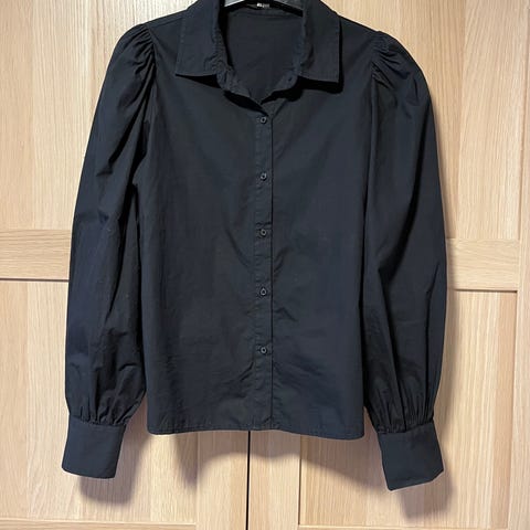 H&M skjorte i svart farge, størrelse M for dame. Laget av bomullsmateriale. Skjorten har en enkel design med krage og knappestolpe.
