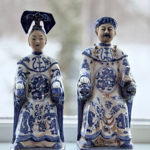 Keramikkfigur av en mann iført kostyme med rød, hvit og grønn farge. Figuren holder en stav og er dekorert med detaljer i svart og gull. Materialet er keramikk, og figuren har en høyde som passer til dekorasjon eller samling.