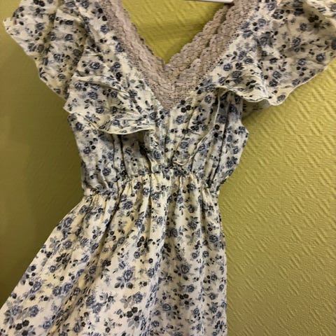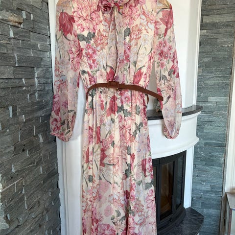 Hellång maxikjole från By Timo i strl S men den sitter bra på mig som är M så det är romslig storlek. Jag är 174 cm och den går helt ner till golvet på mig. Fint blomster mönster, underkjol i bomull på nedre del. Brukt en gång i super fint stand