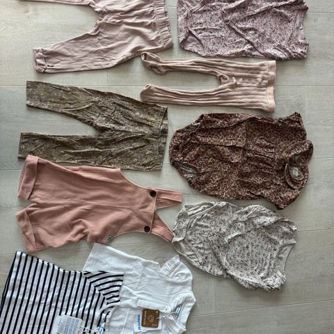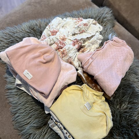 Klespakke med heldress fra hummel str. 86, hjemmwstrikket genser, body fra lindex, 2 hjemmestrikka sokker (ca. 14cm), kjøpe sokker, ull lue fra mp (litt løs dusk, se bilde), ullhanskwr fra name it (litt misfarging)