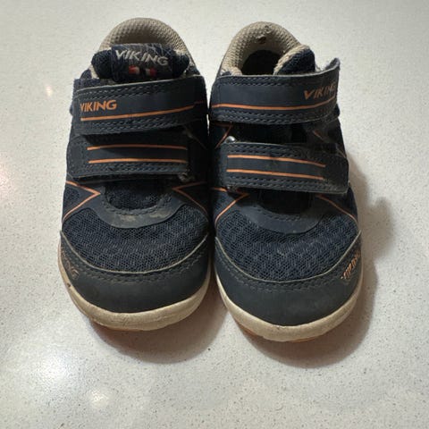 Joggesko for unisex i størrelse 22. Skoene er blå med borrelås for enkel justering. Yttersålen har mønster for grep. Brukt til et barn, mye bruk igjen.