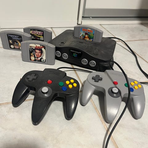 Watermelon Red N64 konsoll med strømforsyning og AV kabel.