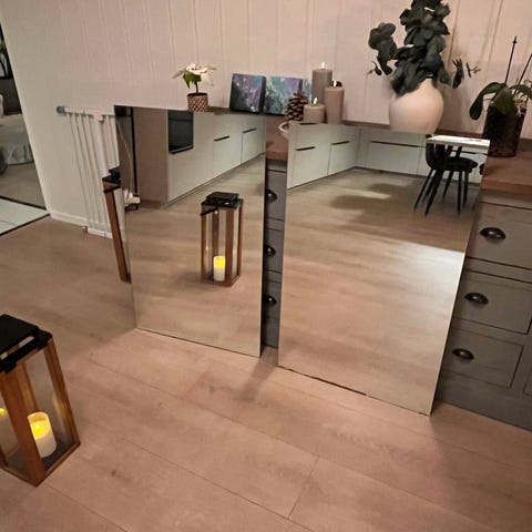 To av speilene måler 100x60 cm, den tredje 100x40 cm. Den er skrå i den ene enden. Gis bort samlet