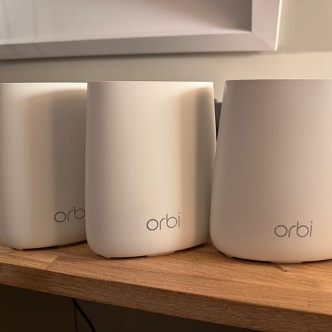 Netgear Orbi AC3000 tri-band WiFi startsett. Består av en RBR50 som router og RB50S som satelitt