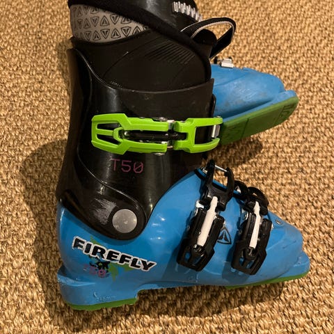 Firefly T50 slalomstøvler/alpintstøvler i str 27, brukt av vår 4-åring. Enkelt å ta av/på med spenner, god passform og grei støtte for barn som kjører litt. Normale merker etter bruk, men solid og klar til sesongen.