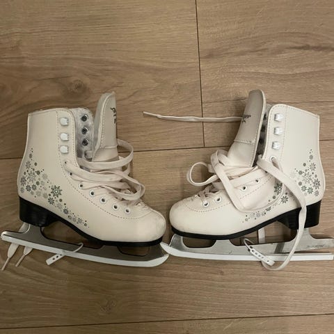Pent brukte danseskøyter i str 29, med teddyfôr for å holde små tær varme på isen.