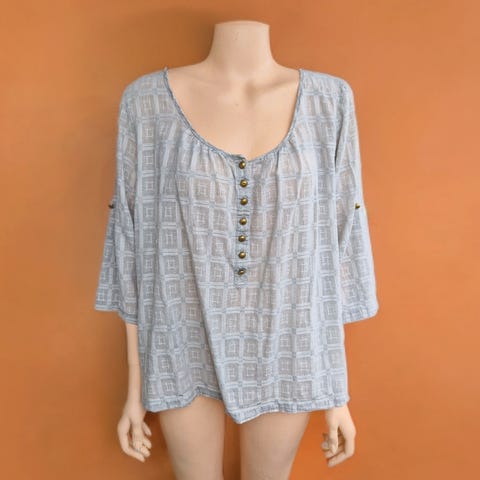 4% Spandex. Fine detaljer. Fasongsydd. Flere snitt, slik at blusen er videre nederst, 115 cm. Høyde fra skulder bak 62 cm. Bredde skulder 42 cm, lengde ermer 45 cm.