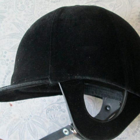 Champion Showring De Luxe lett og behagelig ridehjelm. Fargen er jevnt helt mørk blå, nesten sort, men siden stoffet er fløyel og bildene er tatt med blitz vises fargen feil.