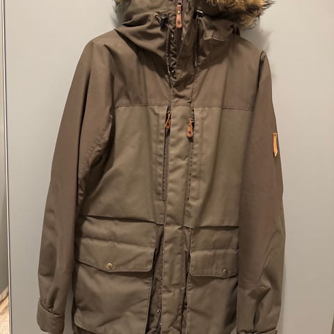 Fjällräven vinterjakke i størrelse S for menn. Jakken er brun og modellen heter Barents parka.