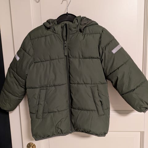 Pent brukt vinterjakke med dinosaurhette selges for kr. 150. Str. 110 men funker fint fra 3-4 år som parkas:)