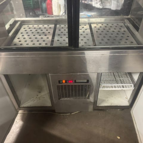 Dette er en ekte storkjøkken-kvalitet kjøledisk med glass på tre sider, skyvedører bak og flere glasshyller – perfekt for utstilling av kaker, desserter, bakverk, påsmurt og ferdigretter.