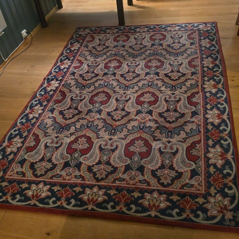 Veldig fint og stort gulvteppe i Ziegler-inspirert mønster. Kjøpt for ett år siden på rugvista. Teppet er laget av en blanding av bomull og polyester. Ca. 10mm tykt