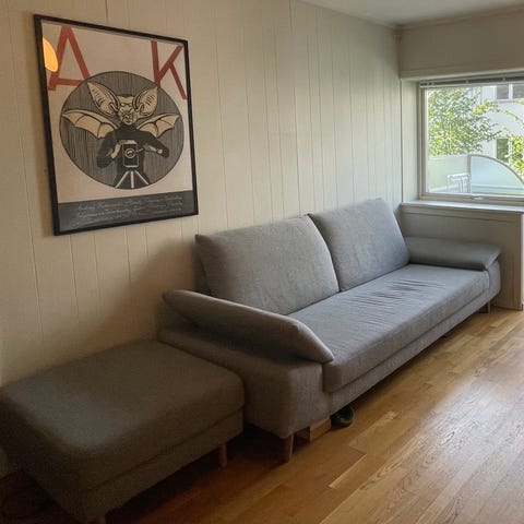 Grå «Johan» 3-seters sofa fra Sofacompany. 6 år gammel, pent brukt og med avtagbare trekk som kan vaskes. Stoff i ull og bein av eik. Liten rift under sofaen men ikke noe man ser (se siste bilde). Evt. kjøper må hente i 5. etasje uten heis.