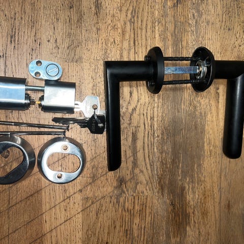 Dørhåndtak i metall med svarte grep. Leveres som komplett sett med to håndtak for gjennomgående montering på dør, samt to runde nøkkelskilt med standard nøkkelhull. Egnet for innvendige dører med tilsvarende låskasse og festeavstand for skruer i nøkkelskiltet. Nøytral, enkel utforming som passer til ulike typer innerdører i bolig eller kontor.