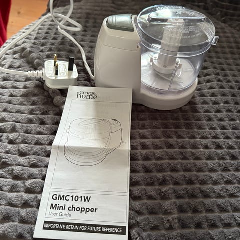 Braun stavmikser med flere tilbehør, inkludert hakker, visp og målebeger. Passer til ulike matlagingsoppgaver som hakking, visping og miksing. Farge svart.