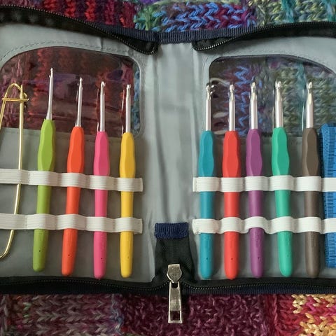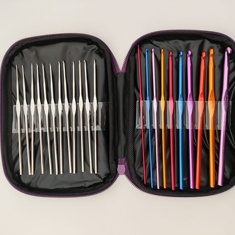 Sett med heklepinner laget i bambus, i lilla mappe i skinn/skinnlignende materiale med glidelås.