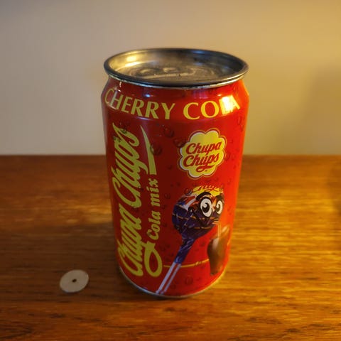 Lip Smacker Coca-Cola metallboks med lokk formet som en brusboks. Boksen er laget av metall og har Coca-Cola-logo på lokket. Boksen er tom.