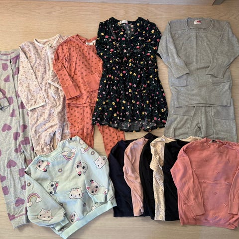 Liten klespakke med klær i str. 98/104 selges billig. Små bruksmerker må påberegnes, men klærne kan fint brukes videre. Klespakken innholder 3 kjoler, 2 overdeler med lang arm og 2 overdeler med kort arm.