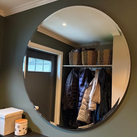 Stort dekorativt speil. Mål 136,5 x 76,5 cm Mål på dekorkant ca 9 cm. Selve speilet har slipte kanter. Selges pga flytting. Må hentes i Hønefoss, evt Bærum eller Ullern.