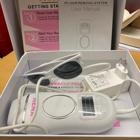Apparatet leveres i eske med oppbevaringspose i tekstil og brukerdokumentasjon/garantikort. Enheten er beregnet for hårfjerning ved hjelp av IPL-teknologi (intens pulserende lys) og kan brukes på hud innenfor angitte hudtoner i bruksanvisningen.