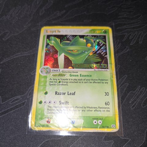 Sceptile Pokémon kort med 100 HP. Kortet viser Sceptile med angrepene Green Essence, Razor Leaf og Swift. Kortet er en del av Pokémon-kortsamlingen og har illustrasjon av Sceptile på forsiden og standard Pokémon-kort bakside.