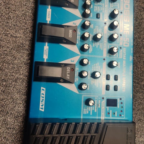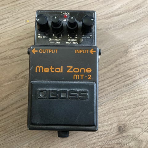 Boss Metal Core ML-2 gitarutstyr. Effektpedal designet for gitarbruk, med kontrollknapper for justering av lyd. Kompakt størrelse og solid konstruksjon, med inngang og utgang for tilkobling til gitar og forsterker.
