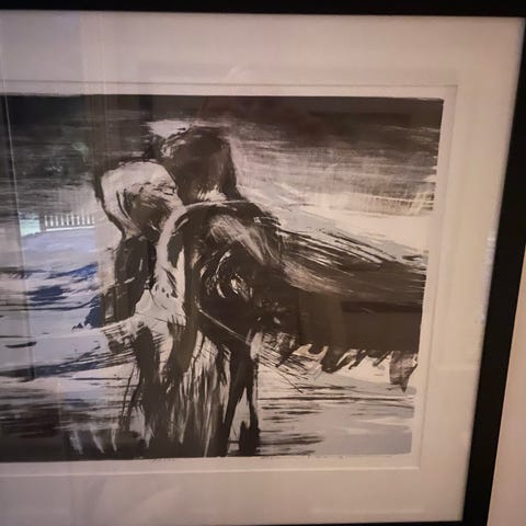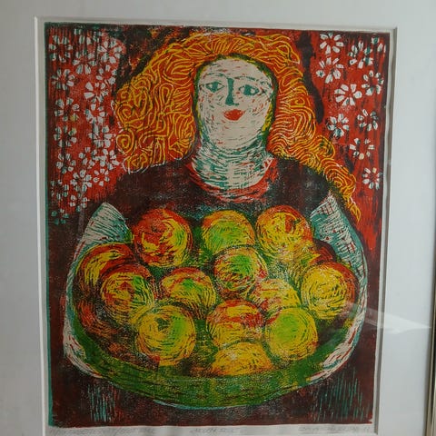 Runi Langum Litografi (32/100 år 2000) - den gamle brannvakta på Rundtom i Drammen. Gullramme 19 x 25 cm, selve litografiet 9,8 x 12, 2 cm.