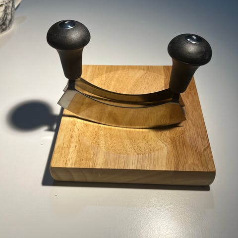 Perfekt for rask, kontrollert skjæring og kutting av urter, krydder og grønnsaker, dette hachoir-settet (et halvmåneformet stålblad festet til et trehåndtak, brukt til å hakke mat) inkluderer et dobbelthåndtak med doble blader og et skulpturert skjærebrett i bøk.