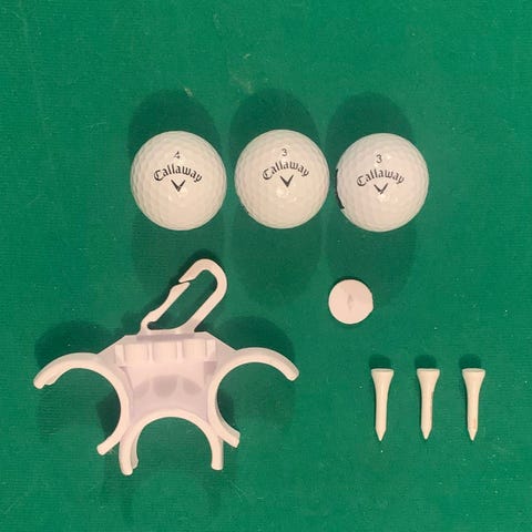 Praktisk golfballholder med plass til 3 golfballer kombinert med en peggholder som er designet for 3 korte pegger(35 mm). Med på kjøpet følger det med 3 Callaway supersoft baller, (plukket på bane, men i meget god stand) 3 korte golfpegger (35 mm) og en 3D printet golfmarkør. Alle disse ser dere på bildet 1.