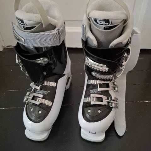 Slalomstøvler - Maxum Ergo-fit Techno Pro. Størrelse 43, bør passe fint om du vanligvis bruker 42-43. Fine spenner med enkel justering. Leddet ankel med utløserknapp for mer behagelig gåing - for eksempel i varmestua og venting i heiskø.