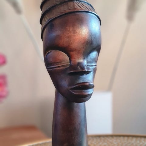 Hane (Onagadori) utskåret av ett trestykke. Skal visstnok være lykkebringende. Høyde 18 cm. Flott arbeid