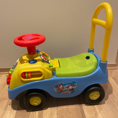 lekebil med ratt og håndtak. Produktet er designet for små barn og har flere farger. Laget i plastmateriale, egnet for innendørs bruk.