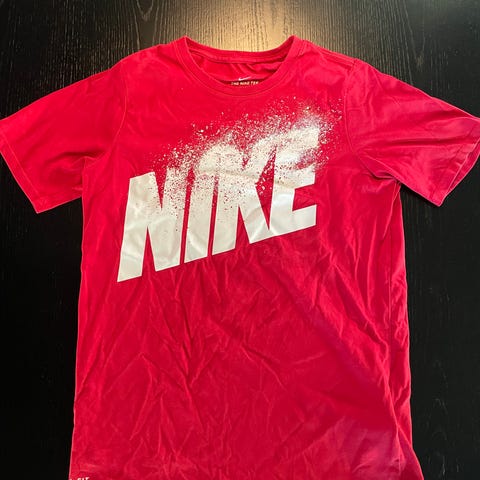Nike Jordan T-skjorte i størrelse 158 for gutt. T-skjorten er rød og laget av bomull. Den har kort erme og et enkelt design med Jordan-logo.