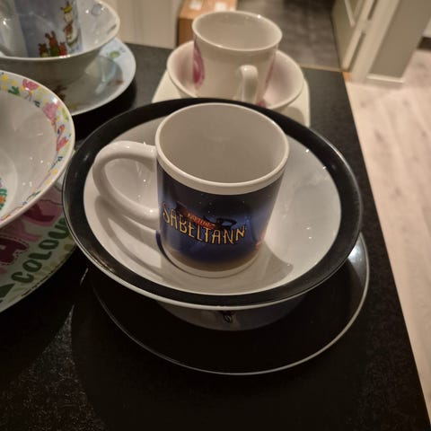 Bestikksett for barn bestående av skje, gaffel, skje og kniv. Bestikket har håndtak i plast med barnevennlige motiver i blått og grått. Egnet for barn og tilpasset små hender.
