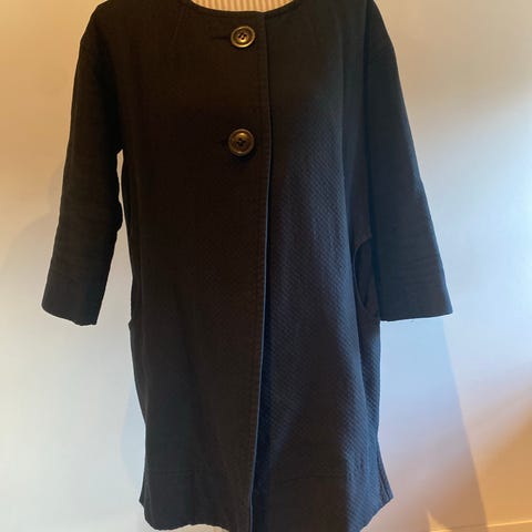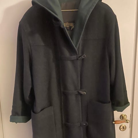 Karakteristisk Lodenfrakk i svart ull, merke Dancoat, str 44 : skulderbredde 13 cm, ermelengde 57,5 , overvidde 112 (under ermene)