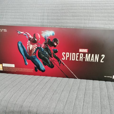Spiderman figur. Har en skade og det er at mannens ben i høyre hånd har knekt og blitt limt. Ellers er figure like hel.