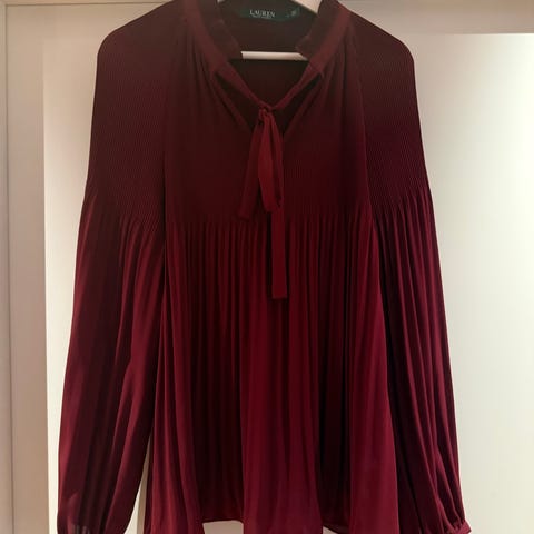 Ralph Lauren bluse i vakker blå farge. Blusen har lange ermer med elastiske mansjetter og en løs passform. Den har en V-hals med knytebånd og plisserte detaljer under brystet, noe som gir et strukturert uttrykk. Enkel å bruke til jobb og fest.