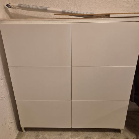 Skjenken har sort lakkerte dører, føtter og sidevegger. Og hvitlakkert bunnplate og topp plate.