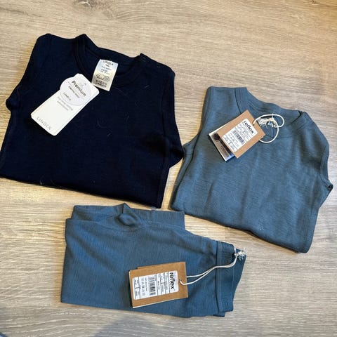 To bodyer i ull str 80, reflex og okidoki. Ullbukse fra POP i str 74/80, buksen er kun brukt ett par ganger.