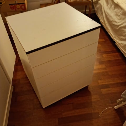 Skapet er godt brukt, men fortsatt i fin og funksjonell stand. Perfekt for gang eller liten entré, med plass til flere par sko.