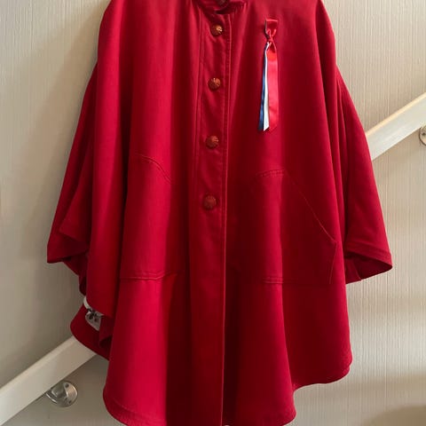 Nydelig cape i tynn ull selges. Liten arm med cape over, en knapp i front, rundt bærestykke 2 stikklommer. Hel foret i rødt silkelignende stoff. Tror ikke dette capet har vært i bruk. Dette er et godt kjøp for den som ønsker et fint ull cape til vår bruk. Kan sende