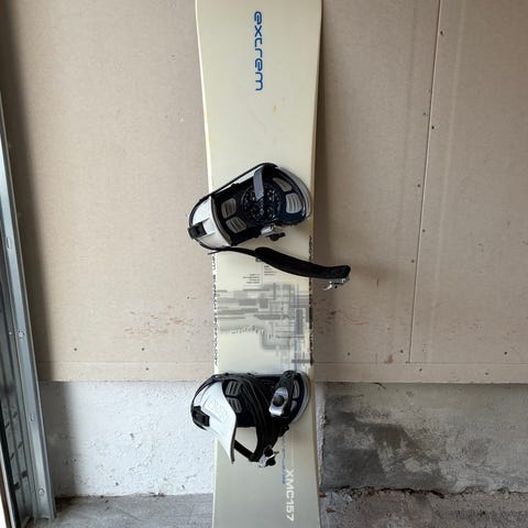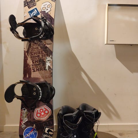 Rome snowboard 153 cm med Union bindinger. Snowboardet har et design med flere klistremerker og en kombinasjon av farger i brunt, svart og hvitt. Bindingene er svarte med hvit Union-logo. Snowboardet er egnet for bruk i snø og vinterforhold.
