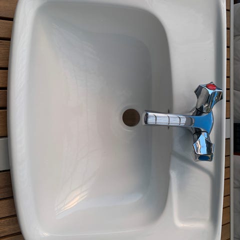 Servantskapet har to dører og en hylle innvendig for oppbevaring. Vasken er integrert med servantskapet og har en krom armatur. Produktet er egnet for baderom og gir funksjonell oppbevaringsplass under vasken. Begge dører har vannskade nederst, se bilder.
