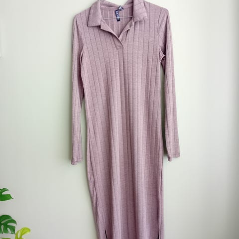 Selges grå ribbestrikket kjole med lange ermer og V-hals. Tettsittende passform som fremhever figuren, og mykt, behagelig stoff som er komfortabelt å ha på. Perfekt både til hverdags og mer pyntede anledninger.