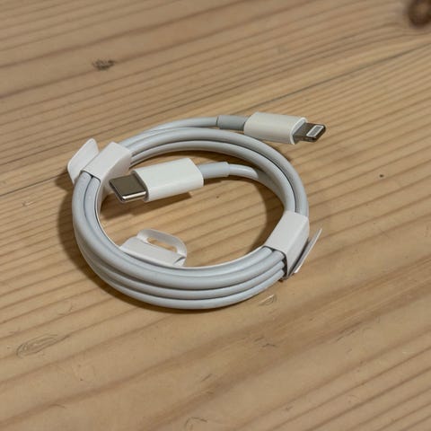 Apple USB-C to Lightning ladekabel med en lengde på 1 meter. Kabelen brukes til lading og dataoverføring mellom enheter med USB-C og Lightning-porter.