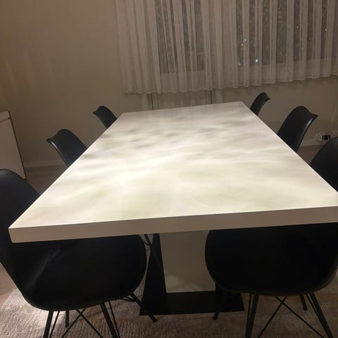 Fint spisebord i hvit høyglansfarge. Solid bord med innlegsplate. Bordet er 2m langt og 1 m bredt. Med innleggsplate blir oengen 2,5 meter. Noen små hakk/bruksmerker er det men bordet kan passe hjemme, leilighet, hybel etc. Det er veldig fint!