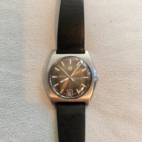 Selger en Certina Certidate herreklokke med manuelt opptrekk. Fungerer som normalt etter opptrekk. Klokken anslåes å være produsert på starten av 1970-tallet basert på serienummeret.