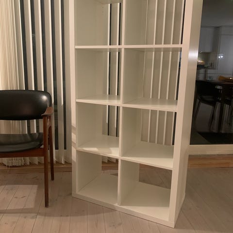 Brunsvart IKEA Kallax hylle med fire rom pluss fire hvite Dröna bokser selges samlet.