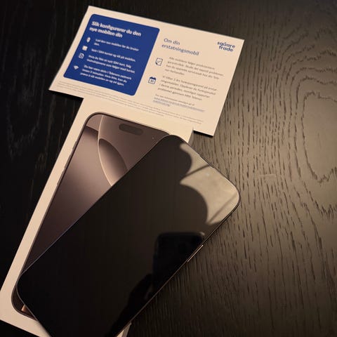 Telefonen ligger esken med privacy skjermbeskytter og MagSafe deksel samt kvittering på 10 tusen.