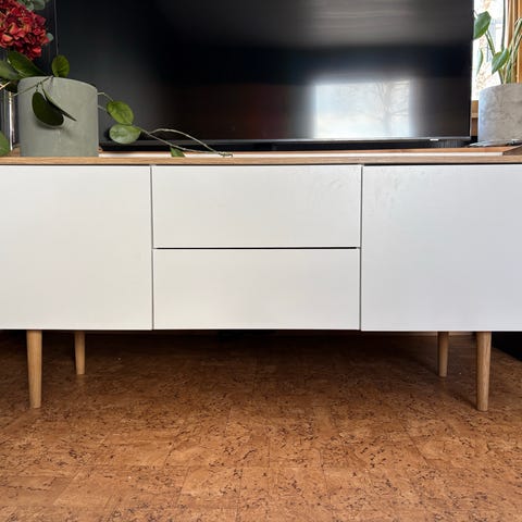 Vurderer å selge en A-line skjenk fra Skeidar. Skjenken har fire skuffer og en dør. Den har dessverre et merke på toppen (se bilde) etter en vase lekket vann. Har ikke prøvd å få bort flekket eller gjort tiltak for å få den bort. Flekken er helt på høyre side av skjenken. Ellers er den pent og lite brukt.